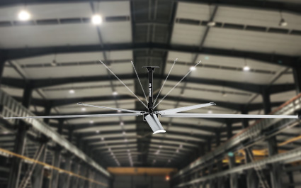 物流仓库储中心使用大型吊扇,能促进整个空间室内外空气流通交换,