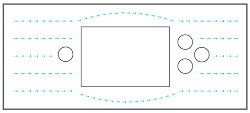 地板上的障碍物会阻碍水平移动的气流,但如若障碍物高度在作用气流以下,障碍物都不会阻挡过多气流。空气在这些障碍物周围平滑地流动,失去一点动量,只会在障碍物后面留下一小块不流动的区域。