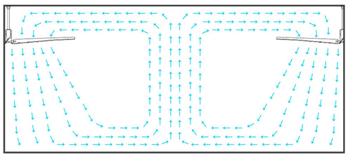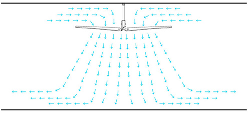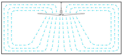 当地面向外推送的气流到达墙壁,墙壁使气流向上偏转。当它碰到天花板后,向上的气流被引导到风扇上方的低压区,然后被拉向地面。这就产生了一种类似对流的气流,这种气流的动量将会越来越大。