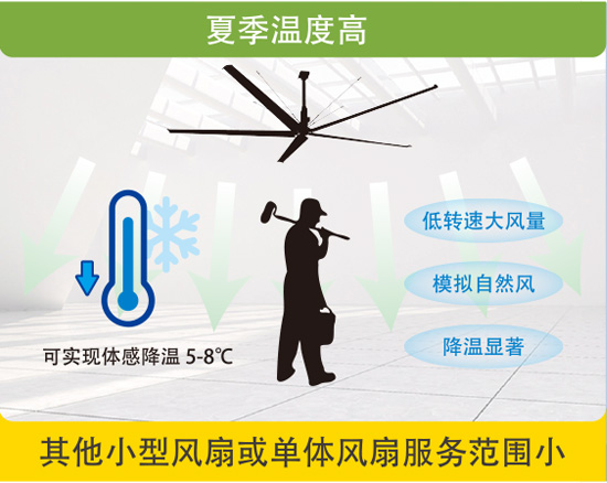 夏季体感温度上升,小型风扇或其他单体降温设备服务范围小。zoty中欧体育官方网站工业大风扇低转速大风量,模拟 2-3 级自然风持续吹拂,可实现体感降温 5-8°C,提升环境质 量及人体舒适度
