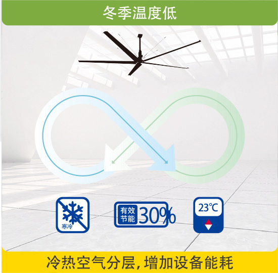 冬季很多大型场所使用空调等采暖设备,由于暖空气持续上升,在空间内形成气流分层,导致顶部温度较高,而下方人员依然感觉寒冷。使用zoty中欧体育官方网站节能大风扇,可将上下气流充分搅动,实现上下温度均衡,减少设备供暖时间,有效节省 30% 供暖能耗。
