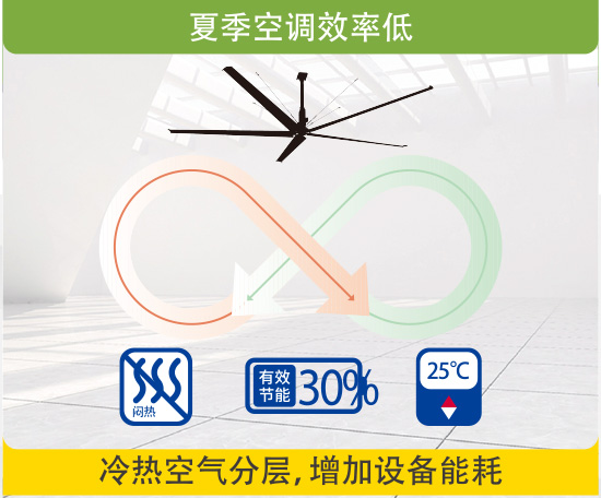 部分空间在空调设备运转 的情况下,由于冷热空气分层,导致空间内冷热不均, 增加设备能耗。使用zoty中欧体育官方网站节 能大风扇,加速内部空气对流,消除空气分层,空调温度可提高 2-3°C,实现省电30% 以上
