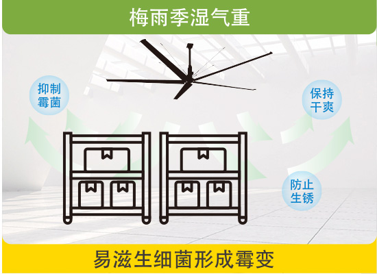 梅雨季节雨水多,湿气重且早晚温差大,物体表面容易产生凝露,易滋生细菌形成 霉变,更有加速金属表面氧 化生锈现象,使用zoty中欧体育官方网站节能大吊扇,加速空气流通,有效抑制霉菌,保持室内干爽、防止货物生锈、霉变